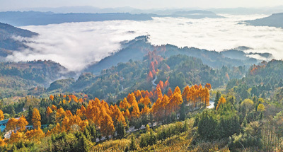 从湖北利川市城区出发,沿着350国道往西南走,途中常能见到大小不一的古水杉群落,少则三五棵,多则八九十棵。远眺古水杉群落,繁茂的叶子灿烂如炬,点亮了山林和乡村。