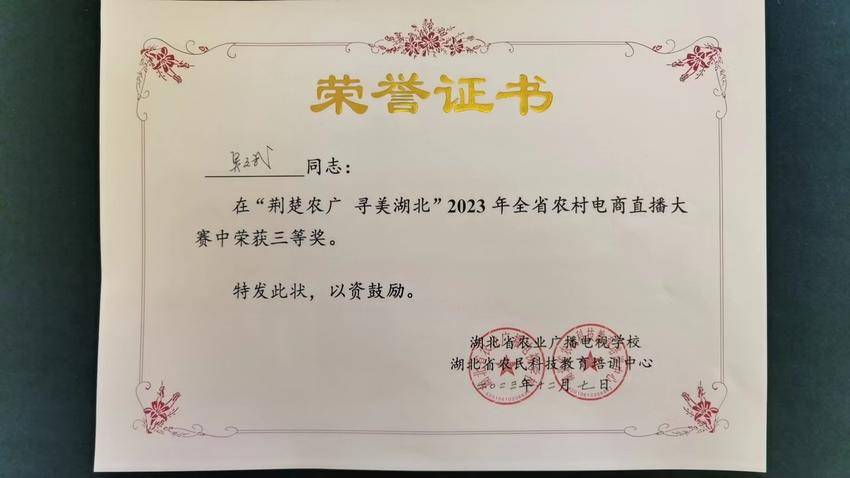 12月7日,由湖北省农业农村厅主办的“荆楚农广 寻美湖北“——2023 全省农村电商直播大赛在武汉圆满落幕,经过激烈的角逐,由孝感市孝南区选派的学员吴斌和鲁雄飞,最终在100名选手中脱颖而出,分别荣获三等奖和优胜奖等荣誉称号,孝南区被评为“优秀组织奖”,有效检验了该区高素质农民教育培训的成果。