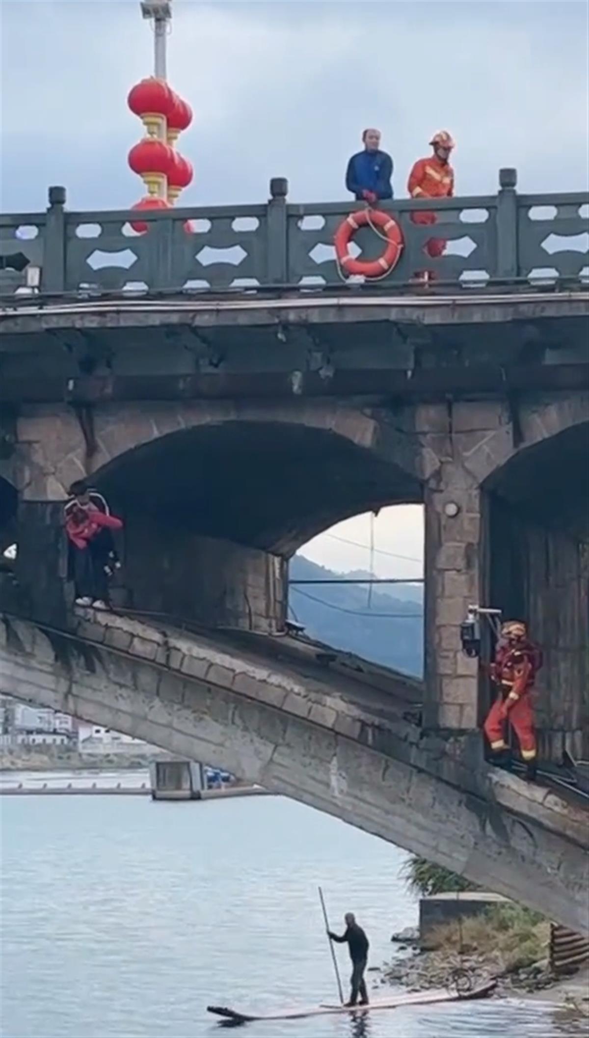 目击者拍摄的视频显示,在一座大桥的桥洞边上,一名男子抱着一个小女孩,似乎要做出轻生之举。桥面上,有消防救援人员备好救生圈;桥洞旁,有两名消防员试图劝说该男子;桥洞下方的水面上,也有多人驾着竹排守着,准备随时施救。