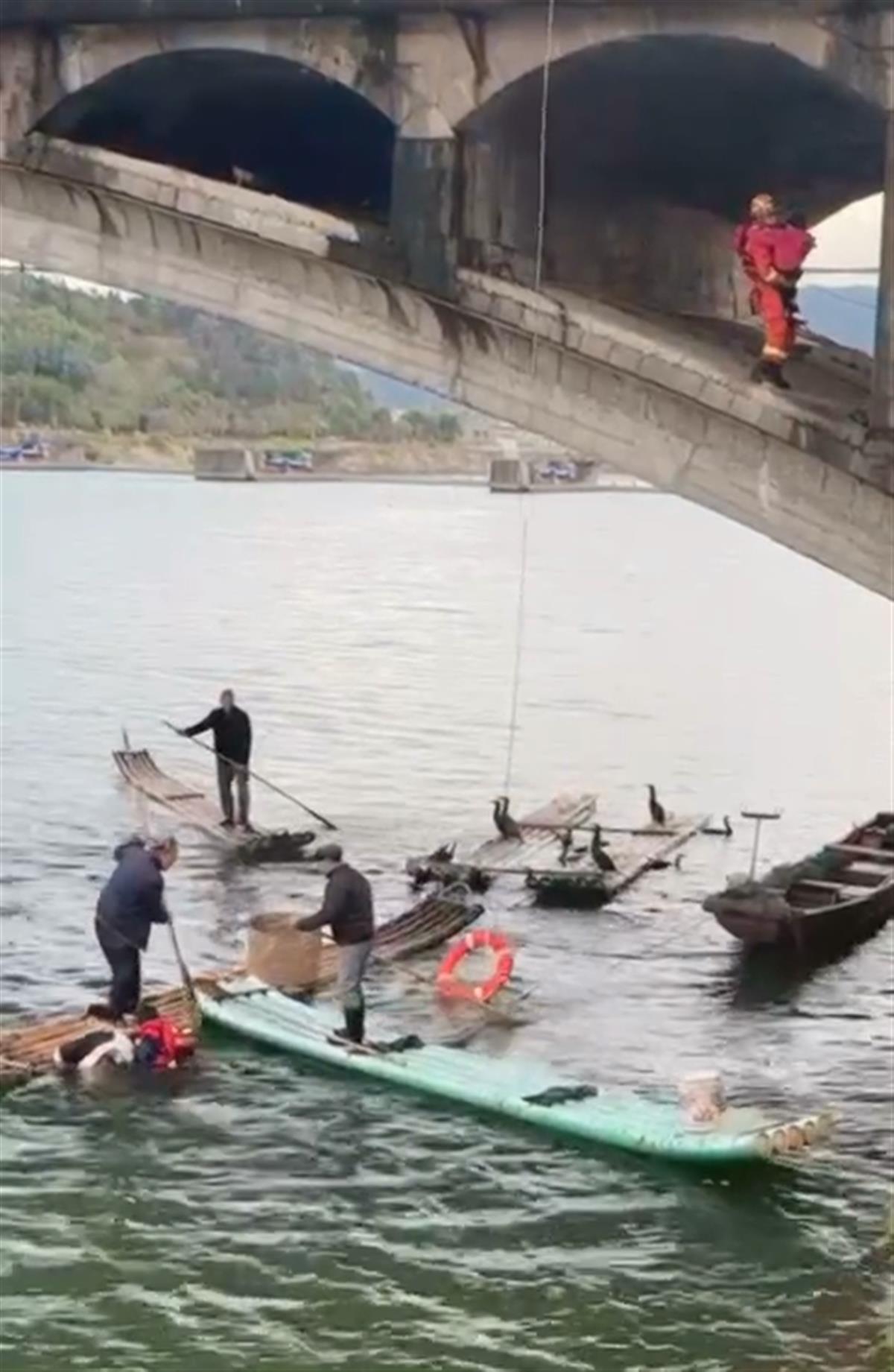 僵持中,该男子突然将孩子放回桥洞,自己背对着水面跳了下去,很快有竹排凑向落水男子,另有救援人员将该男子抱起来送上竹筏。留在桥洞内的小女孩则被消防员抱回了岸边。