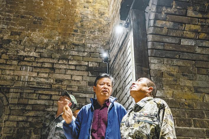 11月21日,护墓员们在巡护八岭山林场的明辽简王朱植墓内部。