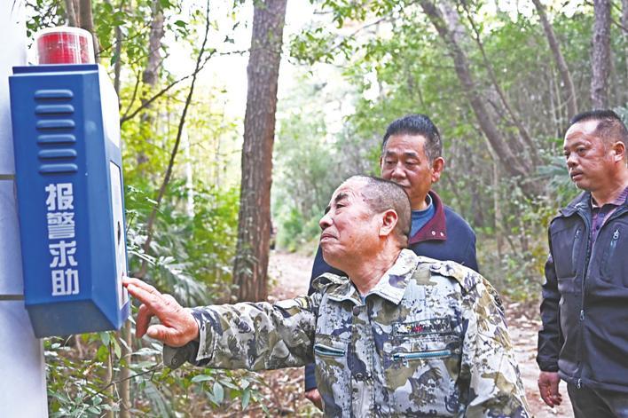 11月21日,护墓员王方哲(左一)在密林深处检查古墓群监控系统与音视频设备是否完好。