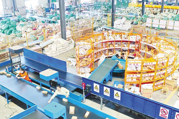 忙碌的快递包裹分拣现场。 (通讯员 周伟 摄)