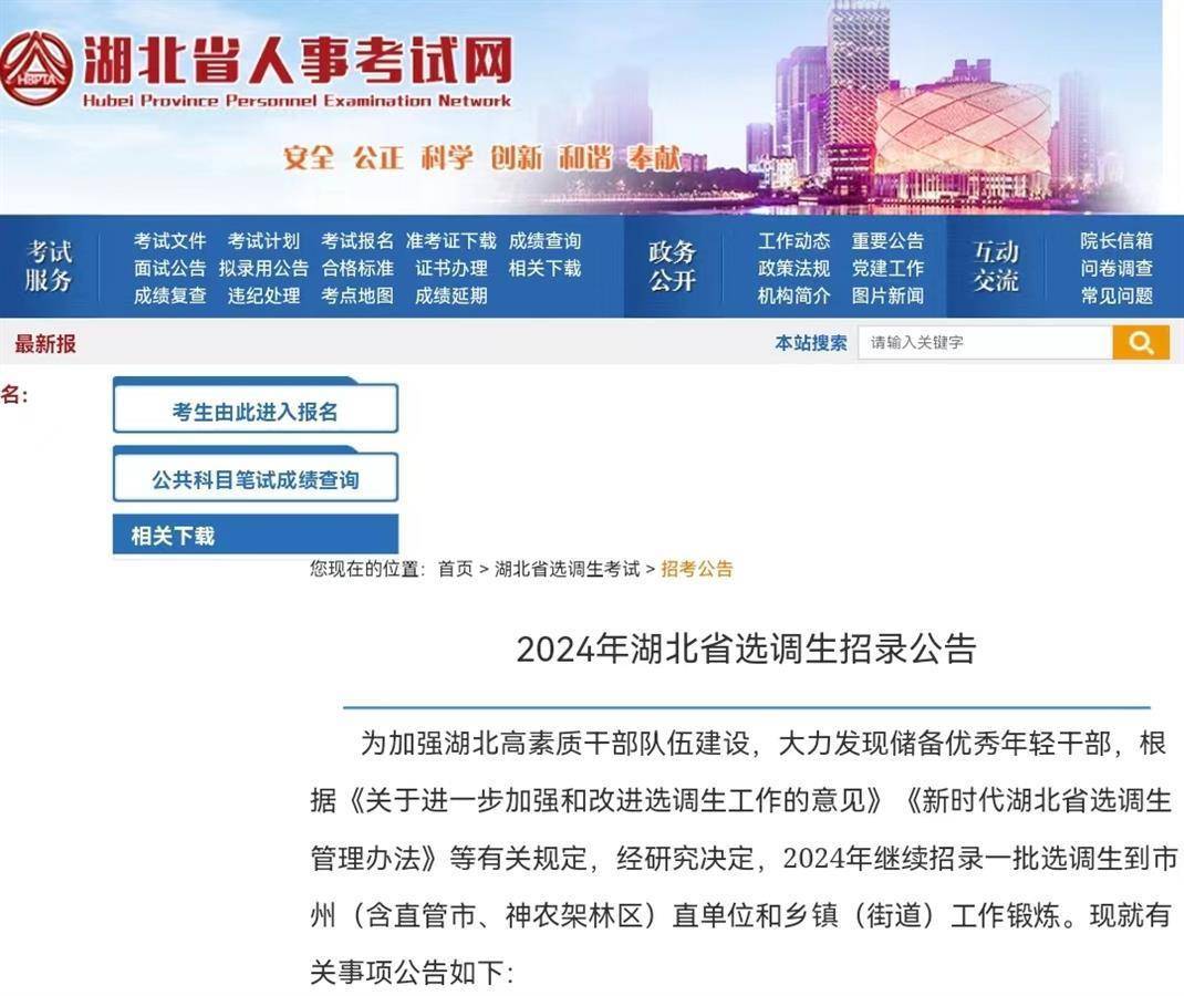 省委组织部、省委编办、省教育厅、省人社厅等部门已联合下发文件,并在湖北省人事考试网等相关网站上发布《2024年湖北省选调生招录公告》,从选调数量、选调对象、选调条件、选调程序、有关政策等方面进行详细介绍。
