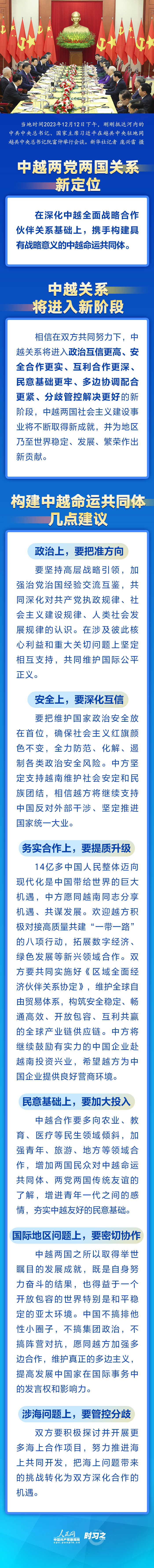当地时间2023年12月12日下午,刚刚抵达河内的中共中央总书记、国家主席习近平在越共中央驻地同越共中央总书记阮富仲举行会谈。双方宣布中越两党两国关系新定位,在深化中越全面战略合作伙伴关系基础上,携手构建具有战略意义的中越命运共同体。