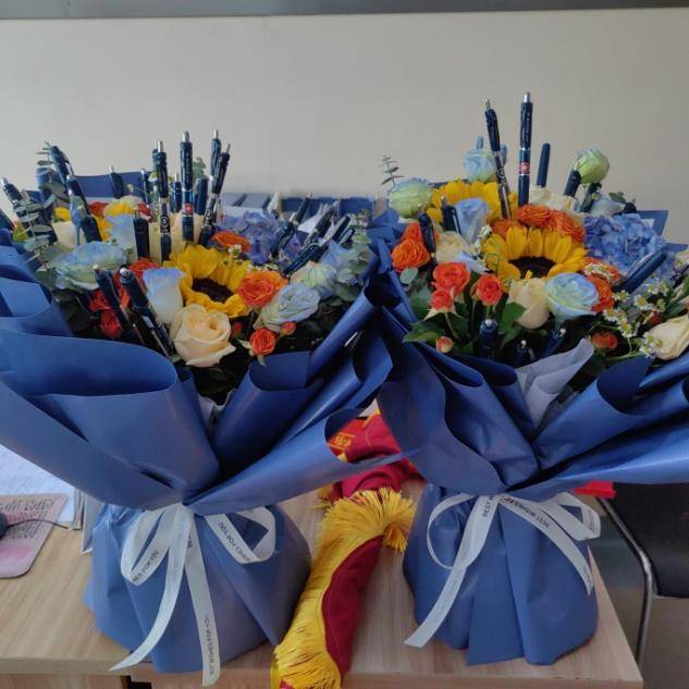 只见杨女士和琪琪手捧两束鲜花,花间插着许多蓝色水珠笔,水珠笔上印有“医生处方用笔”字样。杨女士手拿一面锦旗,锦旗上是一个大大的大拇指,这份独特的礼物瞬间就吸引了周围人的围观。