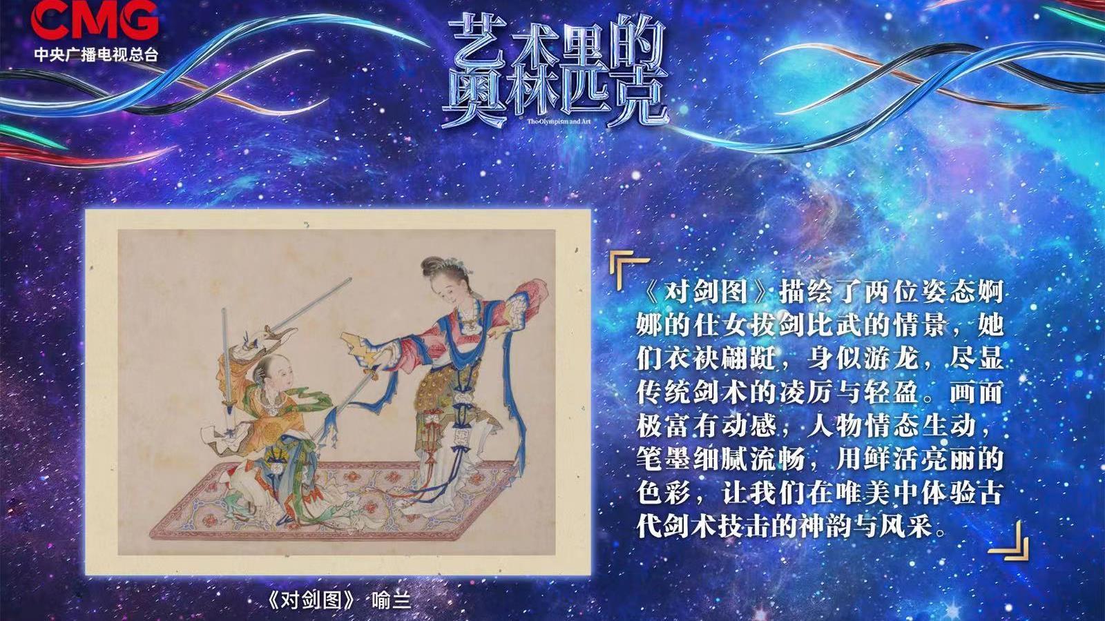 描绘两位仕女对剑比武的情景