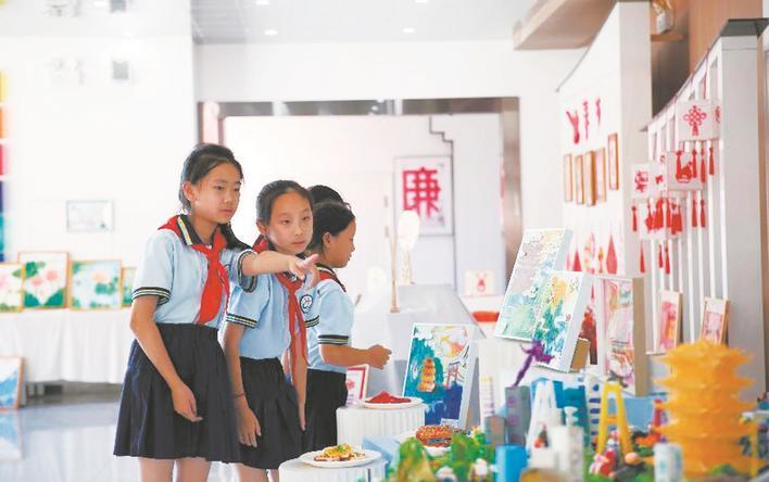 学校创新探索将博物馆置入校园,师生共建了以农耕文化、渔猎文化与地域文化为主题的“三一博物馆”;方圆艺术馆则陈列了课后服务中兴趣社团创作的艺术作品。师生还使用废旧的图钉和吸管制作吉祥物展板,在楼梯间设置少代会代表们提案设计的书架,处处传达勤俭节约、变废为宝的清廉理念,引导师生在学、思、行中牢记有令必行、有禁必止。