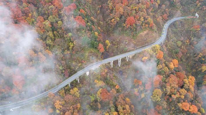 霜风吹拂、层林尽染,公路蜿蜒向前,不仅成为一道风景线,更“走”进村里、“走”进家里,铺就一条乡村振兴之路。这是106国道麻城段。