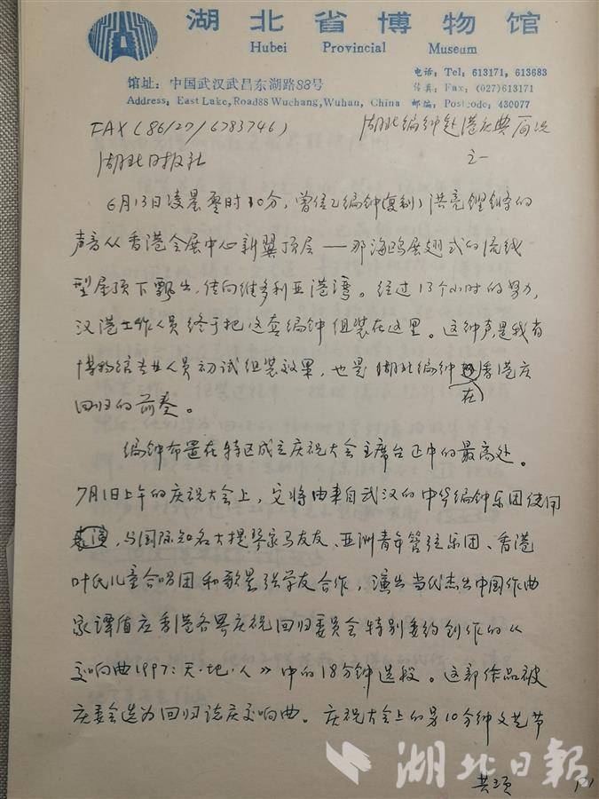出演香港回归庆典演出,用的是曾侯乙编钟复制件。为确保万无一失,湖北运送了两套编钟复制件到香港,一套在主会场提前装台,另一套用于排练和其它配套活动。在排练现场,冯光生难抑激动,客串了一回特派通讯员,给湖北日报社发来一封传真急件,内容是《湖北编钟赴港庆典简况》。