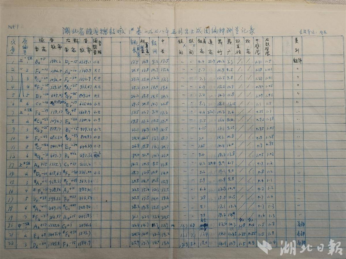 1978年7月,冯光生跟随黄翔鹏、王湘等,在当时的随县展览馆对出土编钟作第一次信息采集。冯光生指着展柜里的档案资料介绍,“这份‘一九七八年五月出土战国编钟测量数据”,是曾侯乙编钟最早的数据记录。正是几位先生手把手带我进入音乐考古世界,我当时就决定,要跟编钟相守一辈子。”