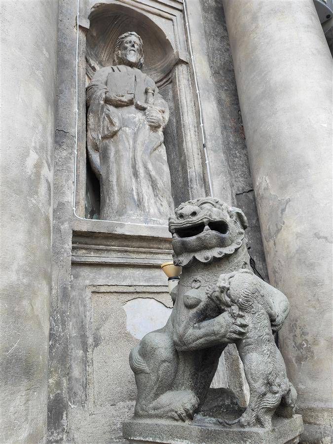 途经圣奥古斯丁教堂,一场当地的婚礼正巧举行。正午的烈日经过彩色玻璃,在教堂内洒下梦幻的弧光,我们的目光却被门口的雕像吸引——几尊圣人像下,竟“端坐”着中国风的石狮子。