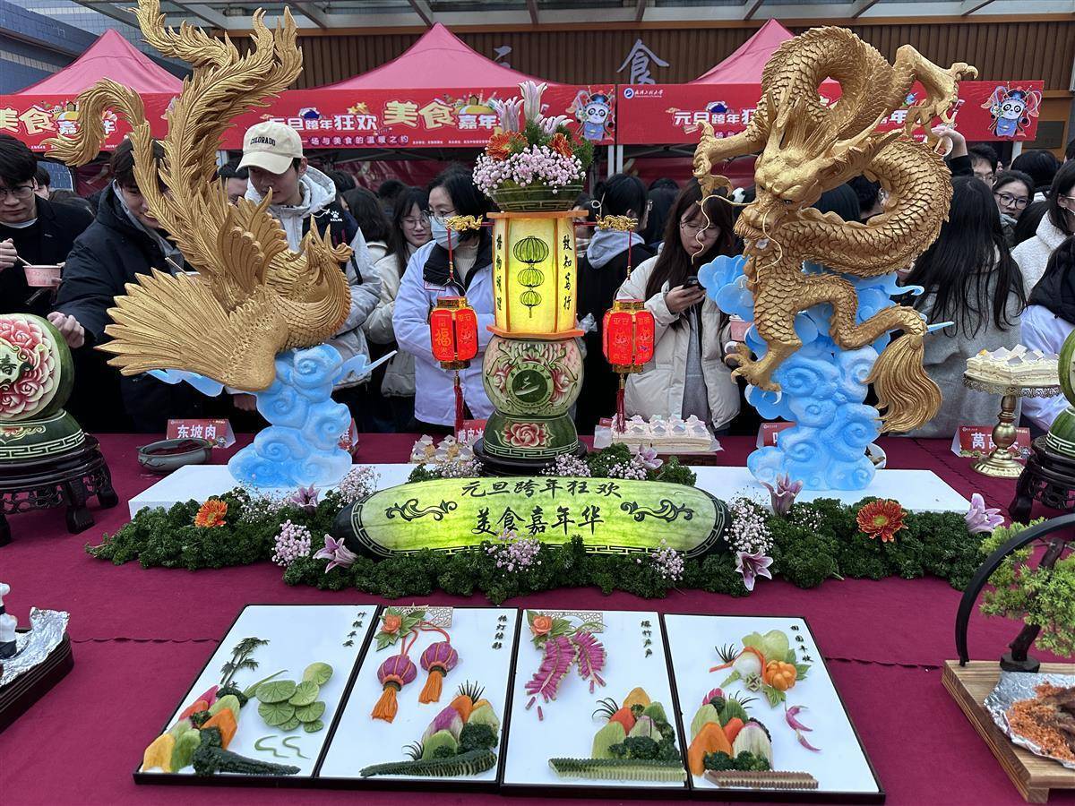 在食堂举行的元旦美食嘉年华可谓全场“最具人气”。烤全羊、红烧肉、烧烤区、西点区、水果区……各具特色美食上演饕餮大秀,现场同学难抵美食诱惑,纷纷排队一饱口福。实验结束后的学生陈晨和同学相约而来,左手拿着羊肉串,右手端着一碗热气腾腾的元宵,口袋里还塞满了食堂阿姨送给他的砂糖橘和零食:“我们专门来排美食,没一会儿就快吃饱了,一会儿还约了同学一起去看节目、猜灯谜,感受热闹的节日气氛,非常开心。”