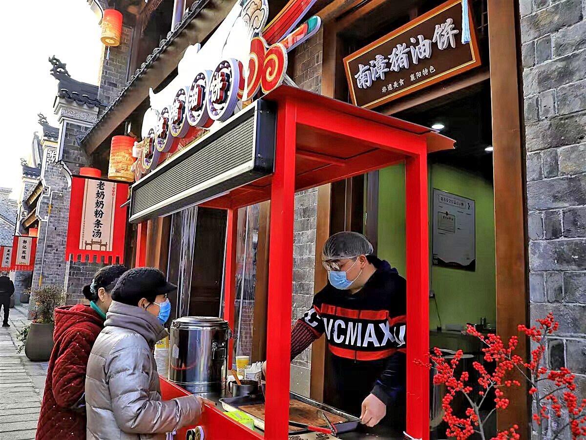 街巷转角,阵阵油饼的香味随风飘来,“南漳猪油饼”店门前,游客排着长队争相购买。