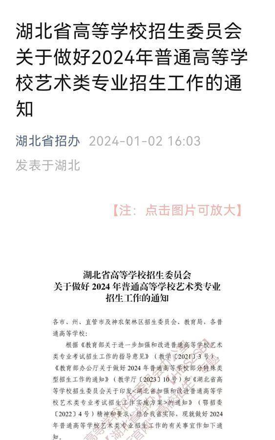 湖北日报讯(记者方琳、通讯员巩平)2024年1月2日,湖北省高等学校招生委员会发布“关于做好2024年普通高等学校艺术类专业招生工作的通知”(以下简称《通知》),对今年艺考招生工作有关事宜做了详细介绍。