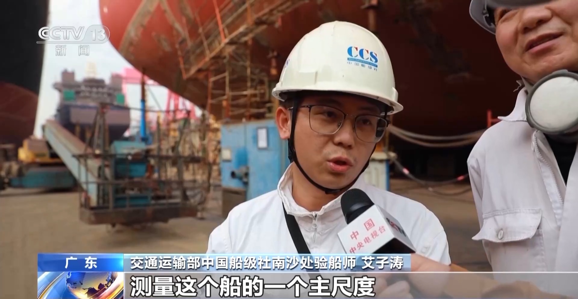 交通运输部中国船级社南沙处验船师 艾子涛:测量船的主尺度,也就是船长、船宽、型深,相当于这个船的身份证一样。