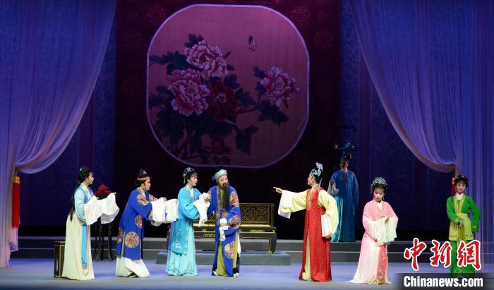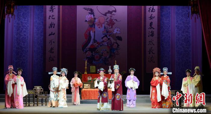 由福建芳华越剧院第七代、第八代青年演员献演的传承版越剧《五女拜寿》在福州芳华剧院上演。 福建芳华越剧院供图