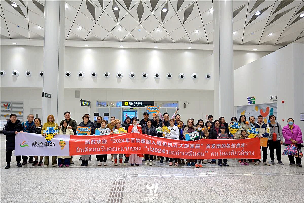 楚天都市报极目新闻讯(记者刘俊华 通讯员何婧 谭凌 宋金戈)2023年12月31日,“2024年百架泰国入境包机万人游宜昌”首发团128名泰国游客落地宜昌三峡机场。