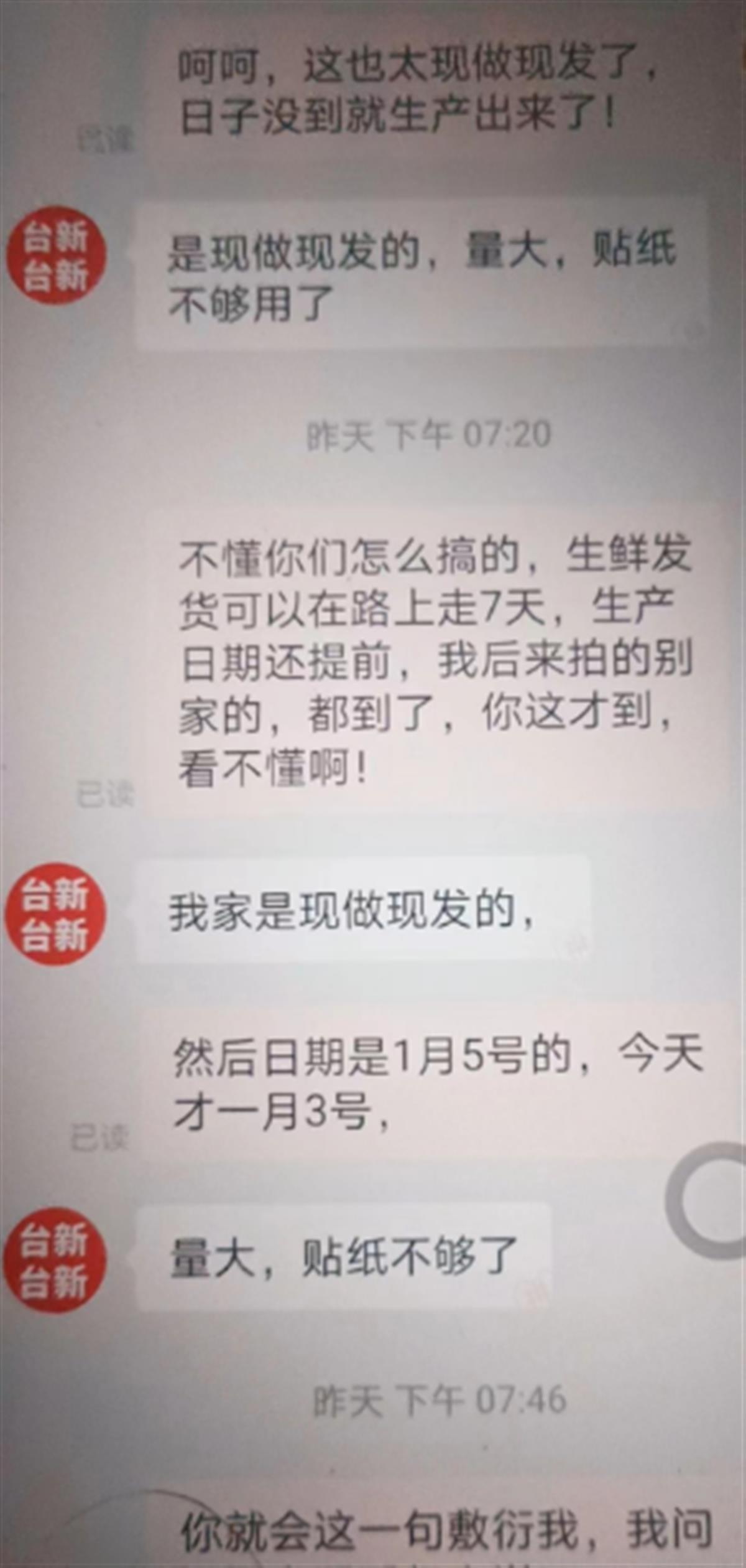 网店客服回应截图(图源:受访者)为此,张女士找到网店客服沟通,但一直没有得到合理的说法。记者从张女士和网店客服的聊天截图中看到,对于生产日期提前的疑惑,客服人员一直解释说:“我家是现做现发的,量大,贴纸不够了。”张女士找到了平台,最终的解决方案是退货退款,目前该订单已退款成功。