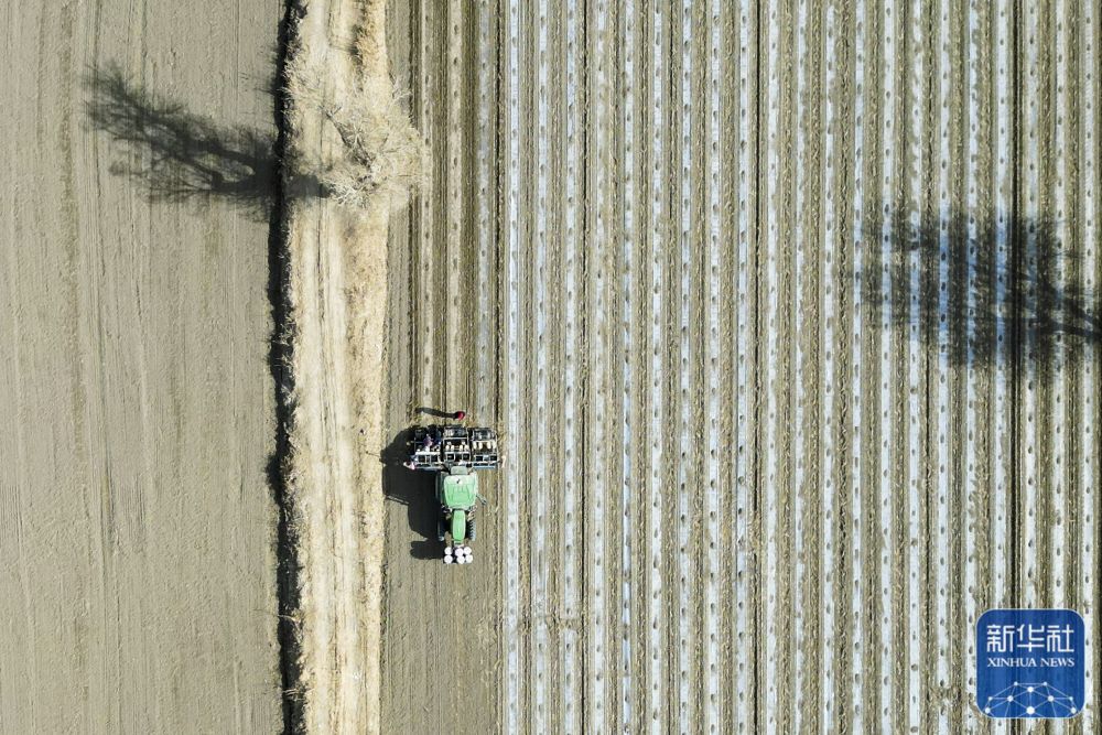 ↑2023年3月29日,在新疆尉犁县,棉农进行春播作业(无人机照片)。新华社记者 郝昭 摄