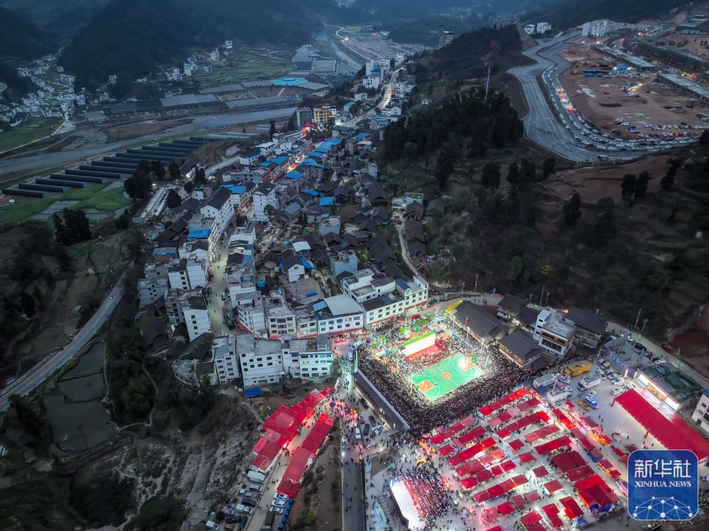 ↑2023年3月26日,贵州省首届“美丽乡村”篮球联赛总决赛在黔东南州台江县台盘村落幕。这是比赛开始前的台盘村全景(无人机照片)。新华社记者 欧东衢 摄