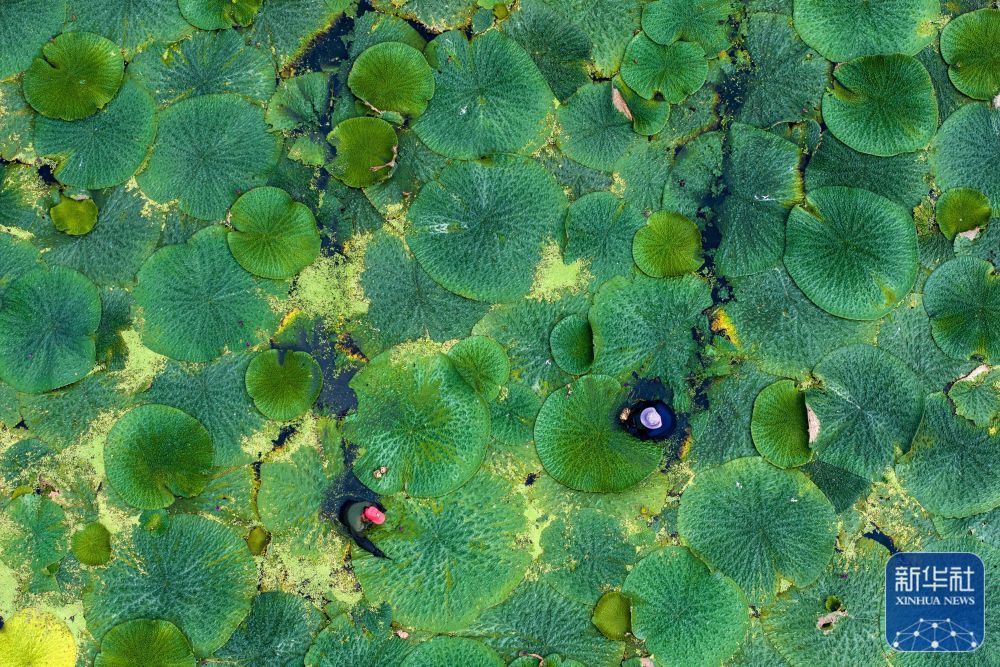 ↑2023年8月21日,江苏省泰州市姜堰区顾高镇申俞村农民在采收芡实(无人机照片)。新华社发(汤德宏 摄)