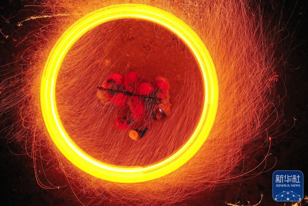 ↑2023年7月5日,河北省滦平县火斗山镇大店子村的民间艺人在表演“抡花”(无人机照片)。新华社记者 牟宇 摄