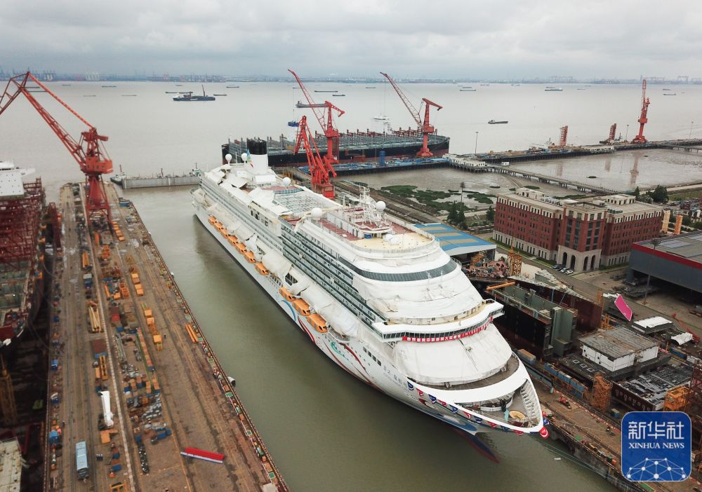 ↑2023年6月6日,由中国船舶外高桥造船有限公司建造的首艘国产大型邮轮“爱达·魔都号”出坞,标志着国产大型邮轮项目全面转入码头系泊调试阶段(无人机照片)。新华社记者 丁汀 摄