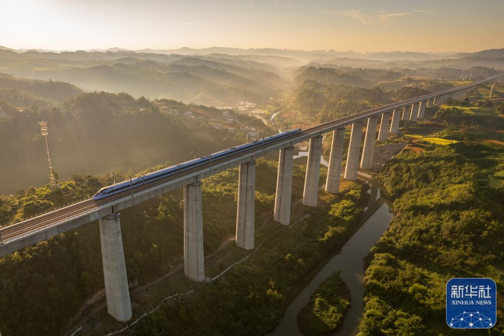 ↑2023年8月31日,一列动车组在晨曦中经过位于贵州省独山县郊外的贵南高铁银坡河特大桥(无人机照片)。2023年,贵南高铁实现全线贯通运营,我国西南和华南地区新增一条交通大动脉,黔桂两地间交通出行更加便捷、西南与华南地区联系将更加紧密。新华社记者 刘续 摄