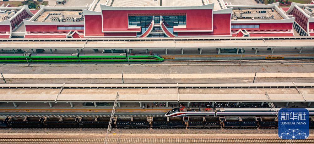 ↑2023年4月13日,“复兴号”(上)和“澜沧号”动车组列车停靠在云南省西双版纳傣族自治州勐腊县中老铁路磨憨站(无人机照片)。当日,中老铁路开行国际旅客列车,昆明至万象间可实现乘火车当日通达。新华社记者 胡超 摄