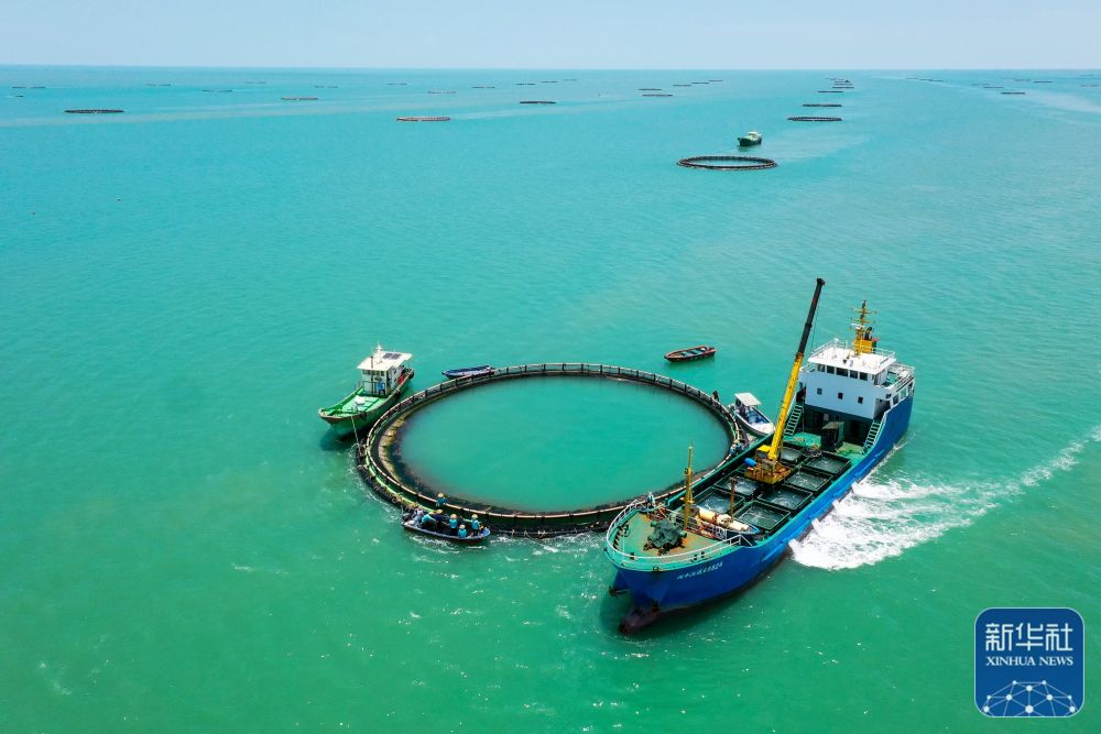 ↑2023年5月27日,在广东省湛江市徐闻县西连镇,徐闻国桥深海养殖有限公司的金鲳鱼深海网箱整齐排列(无人机照片)。新华社记者 刘大伟 摄