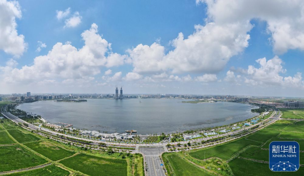 ↑2023年9月6日拍摄的中国(上海)自由贸易试验区临港新片区滴水湖(无人机全景照片)。新华社记者 方喆 摄