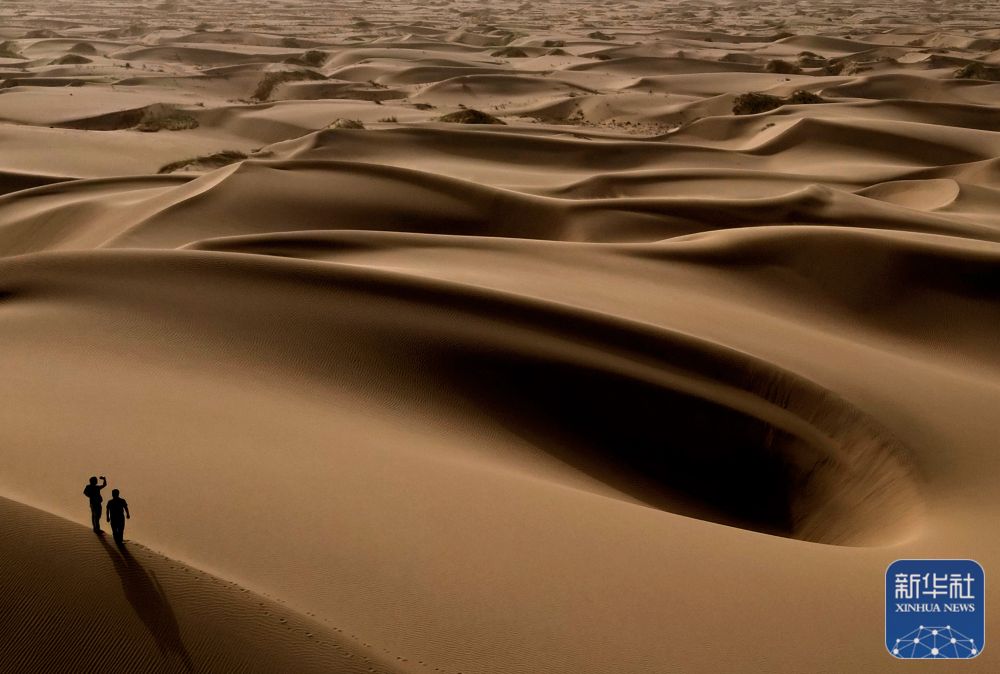 ↑2023年9月7日在新疆喀什地区麦盖提县N39°沙漠旅游景区拍摄的沙漠风光(无人机照片)。新华社记者 李安 摄