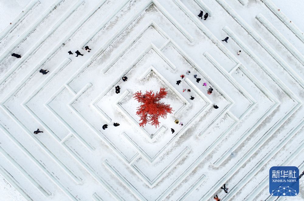 ↑2023年2月12日,游客在内蒙古呼和浩特冰雪节冰雪景区感受冰雪迷宫乐趣(无人机照片)。新华社发(王正 摄)