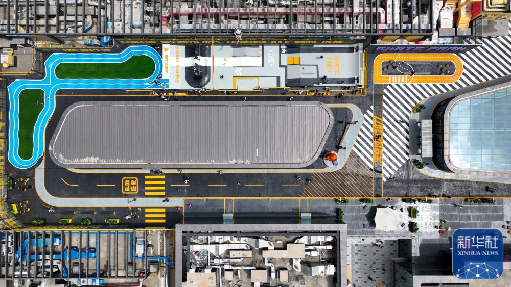 ↑2023年4月28日拍摄的天津中海环宇城购物中心楼顶滑板公园(无人机照片)。新华社记者 孙凡越 摄