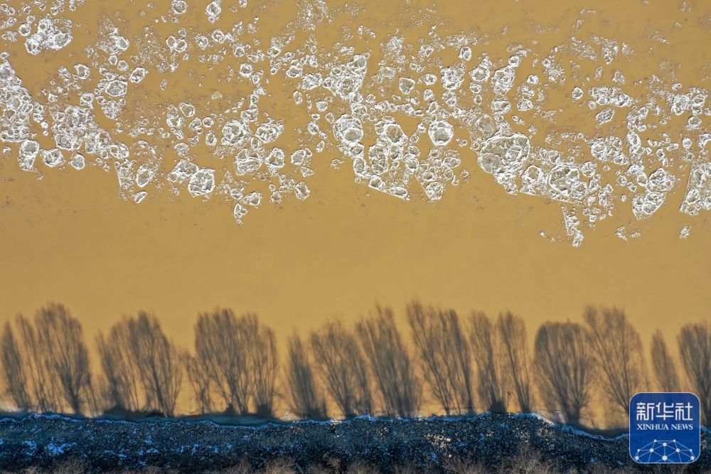 ↑2023年1月27日在黄河济南泺口段拍摄的淌凌(无人机照片)。新华社记者 朱峥 摄