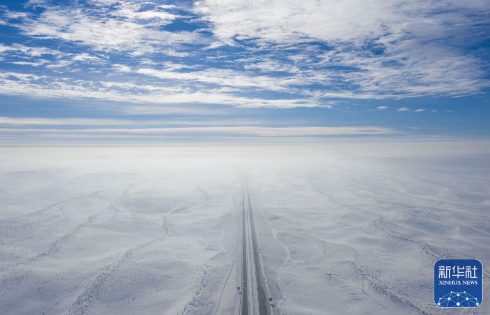 ↑2023年1月16日在新疆境内的古尔班通古特沙漠拍摄的阿勒泰至乌鲁木齐的高速公路(无人机照片)。新华社记者 胡虎虎 摄