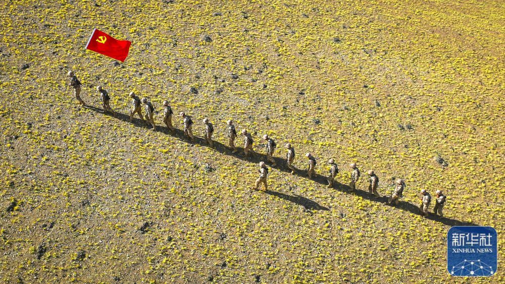 ↑2023年6月30日,新疆军区某合成团官兵高擎党旗在海拔5400米的喀喇昆仑高原巡逻(无人机照片)。新华社发(周凯威 摄)