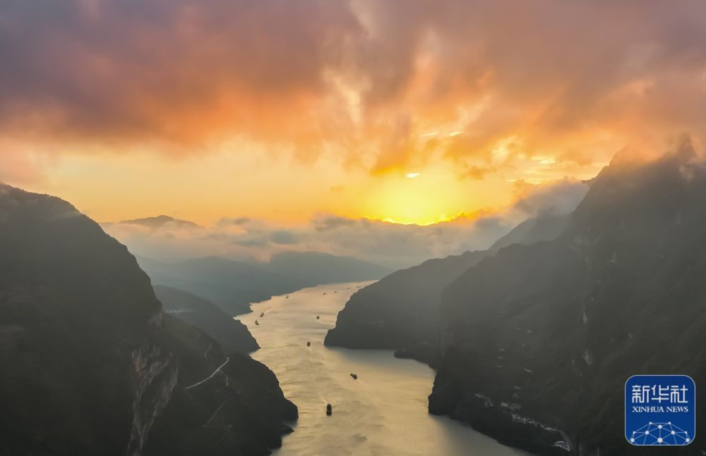 ↑2023年10月8日,船舶行驶在长江三峡西陵峡湖北省宜昌市秭归县水域(无人机照片)。新华社发(郑家裕 摄)