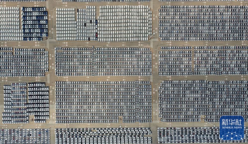 ↑2023年7月7日,汽车整齐排列在天津港海嘉滚装码头(无人机照片)。新华社记者 赵子硕 摄