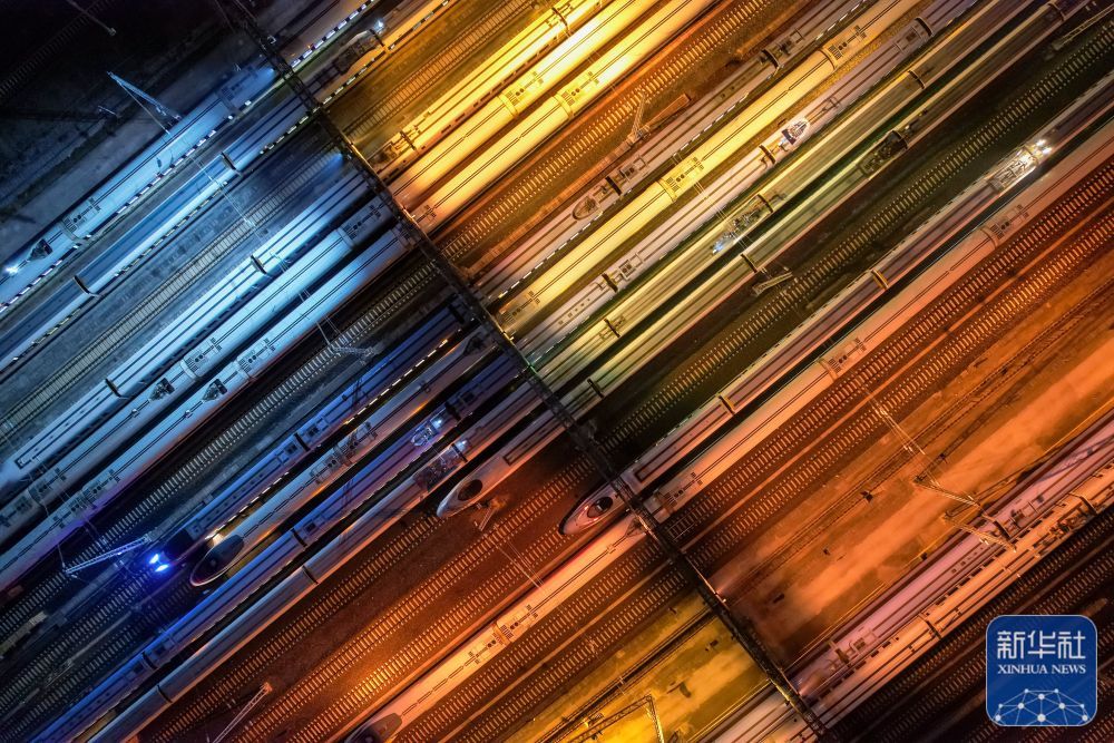 ↑2023年1月6日,动车组列车停靠在贵阳北动车所内(无人机照片)。1月7日,2023年春运启动。新华社记者 刘续 摄