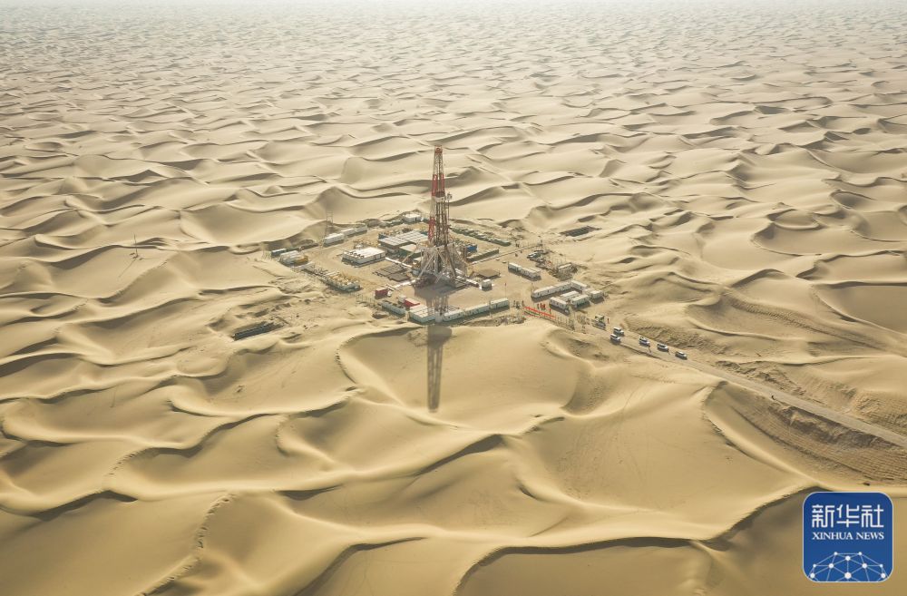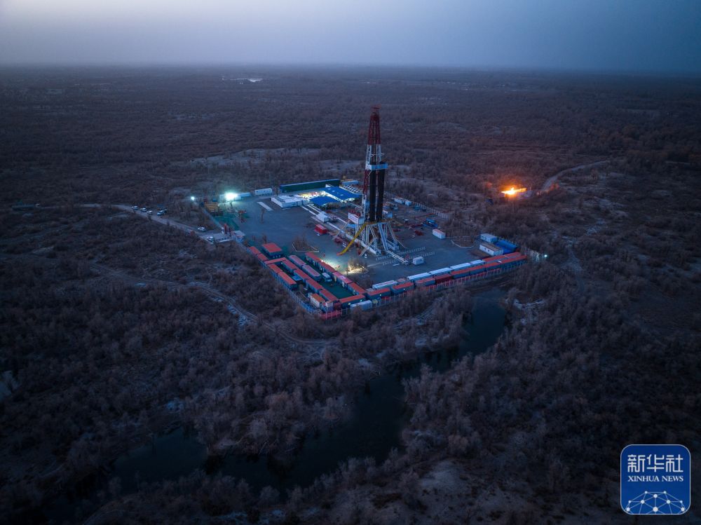 ↑2023年11月15日拍摄的中国石化“深地一号”跃进3-3XC井(无人机照片)。中国石化11月15日宣布,公司部署在塔里木盆地的中国石化“深地一号”跃进3-3XC井测试获得高产油气流,日产原油200吨,天然气5万立方米。该井完钻井深达9432米,刷新亚洲最深井斜深和超深层钻井水平位移两项纪录。新华社记者 肖艺九 摄