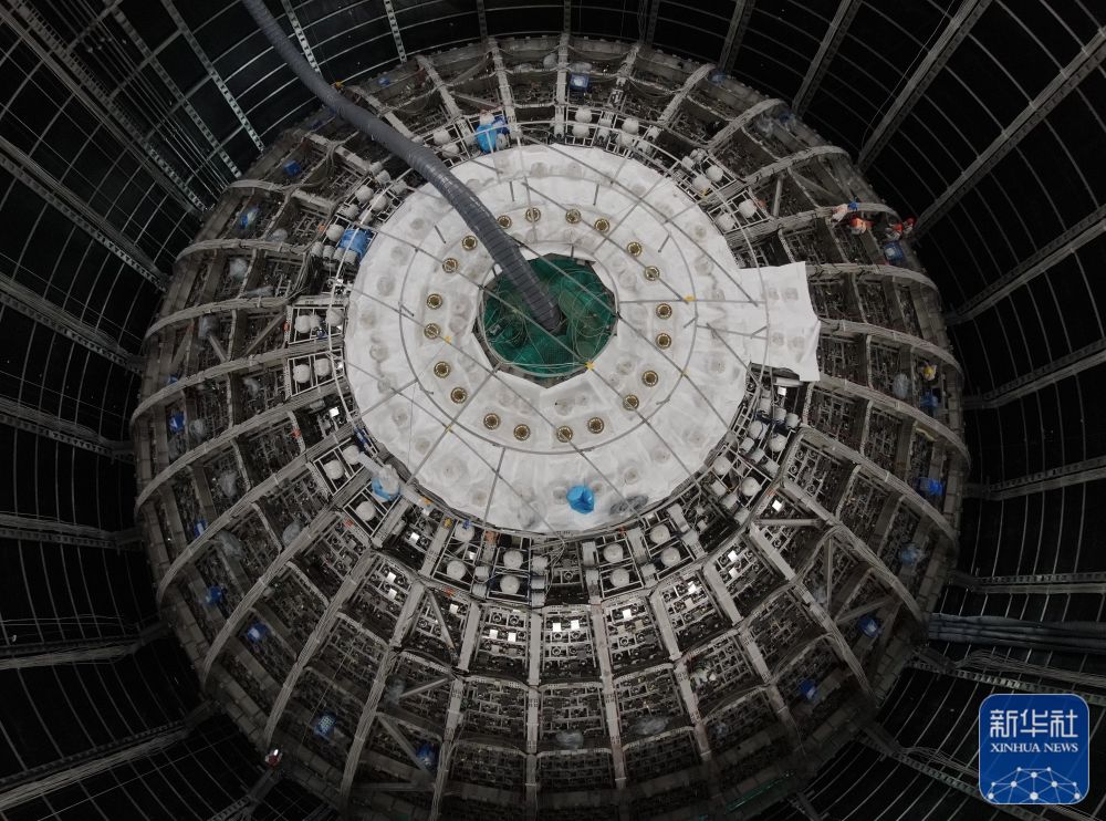 ↑2023年6月14日,在广东省江门开平市,位于地下700米的江门中微子实验探测器呈现巨大的球形结构(无人机照片)。新华社记者 邓华 摄