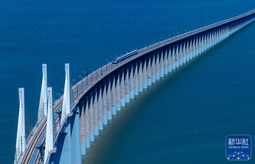 ↑2023年9月19日,一列运行试验车组驶过福厦高铁湄洲湾跨海大桥(无人机照片)。9月28日,中国首条时速350公里跨海高铁——福厦高铁正式开通运营。新华社记者 魏培全 摄