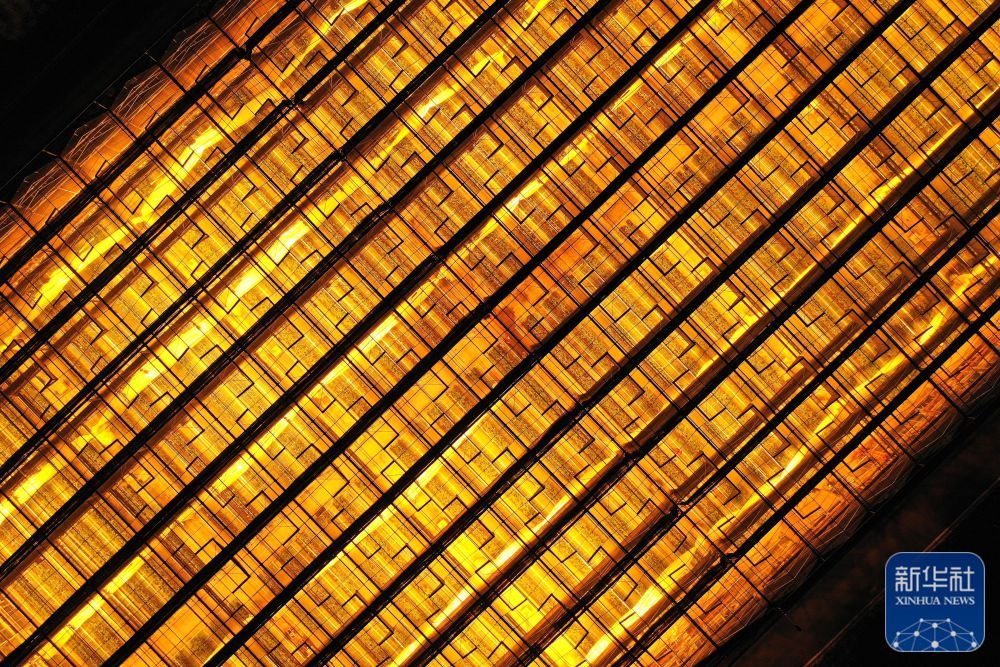 ↑2023年5月25日拍摄的贵阳市开阳县南江蔬菜良种繁育中心育苗大棚夜间补光场景(无人机照片)。补光更有利于种苗生长,缩短育苗周期。新华社记者 杨文斌 摄