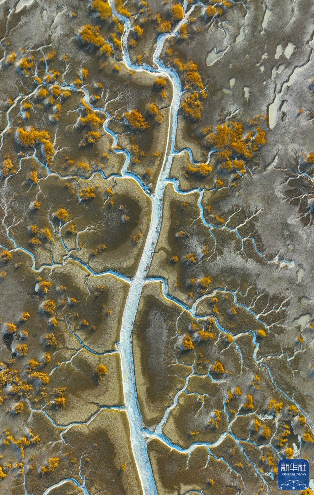 ↑2023年2月1日拍摄的辽宁盘锦辽河口湿地“冰脉”(无人机照片)。海水在潮汐作用下涌入辽河口湿地的潮沟,并凝结成冰,从高空看去,宛若蜿蜒曲折、形态各异的“冰脉”。新华社记者 杨青 摄