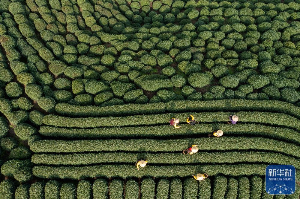 ↑2023年3月13日,浙江杭州龙井村的茶农在采摘西湖龙井“明前茶”(无人机照片)。新华社记者 徐昱 摄