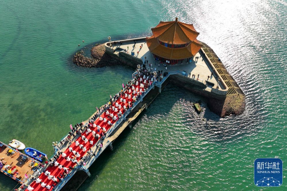 ↑2023年11月12日,在山东省青岛市栈桥回澜阁前,新人参加集体婚礼(无人机照片)。新华社发(王海滨 摄)