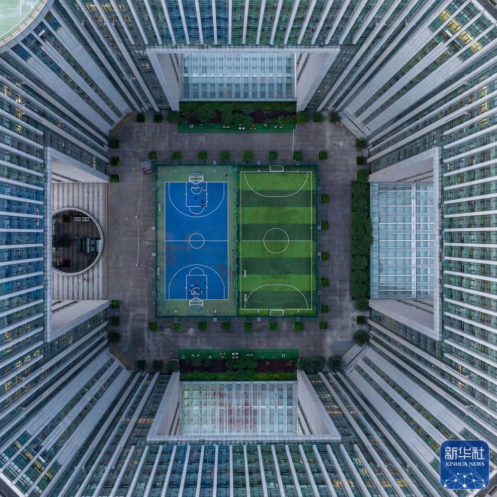↑2023年6月13日,市民在南京市建邺区一处建筑内设置的微型体育场内运动(无人机照片)。新华社记者 李博 摄