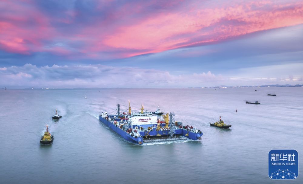 ↑2023年6月8日,“一航津安1”号沉管运输安装一体船将E23管节和最终接头浮运至安装现场(无人机照片)。6月11日凌晨,世界最长最宽的钢壳沉管隧道——深中通道海底隧道管节最终接头合龙,32个8万吨级的管节和最终接头犹如海底巨龙横卧珠江口,为这条全长24公里、集“隧、岛、桥、水下互通”于一体的超级跨海集群工程打通关键环节。新华社发